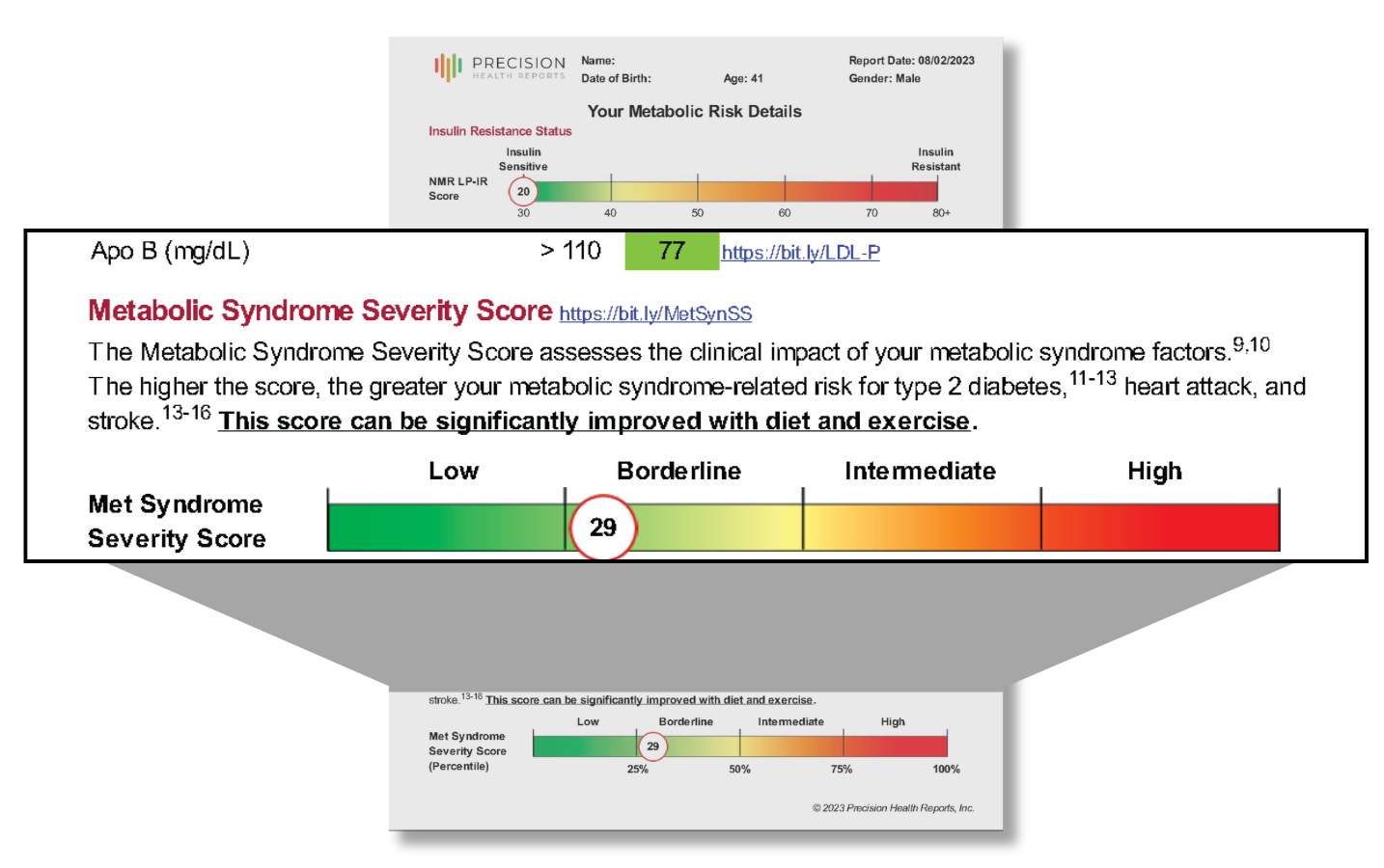 At Precision Health Reports, we integrate both the traditional diagnostic criteria and the MSSS into our Cardiometabolic Risk Assessment, alongside advanced biomarkers such as ApoB, LP-IR, GlycA, and Lp(a). This approach allows us to deliver individualized, guideline-based prevention plans that go far beyond routine lab testing. Here is what you see in a Cardiometabolic Risk Assessment or an Advanced Metabolic Health Assessment report: